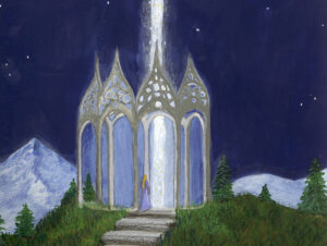 “Imagine that you are trekking up a great alpine hill filled with pine trees. The air is crisp and cold and full of the invigorating aroma of pine. The rosy sun begins to set and you can see your breath as you ascend to the crest of the hill. You pause at the top and discern a tall sanctuary made of graceful Gothic latticed arches sitting on a small summit ahead. This is the Sanctuary of Wholeness you have been seeking. You approach the sanctuary and regard its uplifting structure with its snowy mountain range as a backdrop. As you reach the sanctuary the sun has already set and the stars are showing themselves in the deep indigo sky. You climb a few levels of stairs to the sanctuary and realize it is nearly five times your size. You step through an archway and peering up you notice there is no ceiling to the chamber as it is open to the night sky. All you can see above are the twinkling stars.