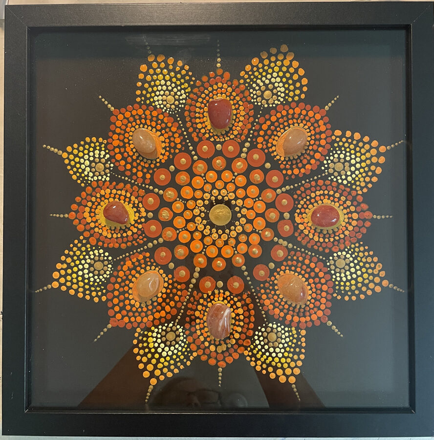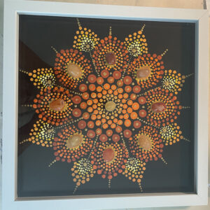This hand painted 12×12 inch “Inner Power” crystal dot mandala represents the power center in the Solar Plexus chakra (and Sacral chakra) of the radiating inner sun of golden energy that enhances your self-confidence, self-worth, and inner power. Crystals of Carnelian and Golden Healer Quartz add to its energetic power. Specify black or white shadowbox frame. $190.00