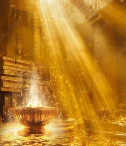 You notice that there is a larger fountain near the center of the room that is fountaining the golden sparkles into the air. You walk towards the fountain mesmerized and feeling joyfully giddy. As you stand before the fountain a beam of golden-white light shines down on you. You feel its light infuse your heart creating a warm glow there. Lakshmi asks you to raise your palms up and she showers a cascade of golden glitter-like energy that fills up your palms. The energy is absorbed into your body as your palms continue to fill, until you radiate golden light. The golden light seems to merge and activate your own inner divine light. There is something magical that happens here. A realization – a perception that your own inner goodness and worth radiate with the same sense of abundance that seems limitless in this room. Lakshmi has only magnified your own ability to radiate your golden worth and magnetize prosperity and abundance into your life. The fountain of goodness in your heart merges with the fountain of abundance in the world. You feel you are radiating a golden glow that brings you a greater sense of confidence in your ability to magnetize abundance and prosperity into your life. You bask in this golden glow for a few moments, and when you feel complete, you thank Lakshmi for her guidance, and retrace your steps back to your present state of awareness. You can return here with Lakshmi whenever you need a reminder of your ability to magnetize prosperity.