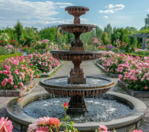 You are walking on a path that winds through a lush garden of roses of all colors. The flowers nod their heads to you as you pass and send you uplifting energy that makes you smile in their presence. You see a grand tiered fountain is ahead on the path and you pause to gaze at its sparkling water splashing from tier to tier. You listen to the bubbling sounds of the fountain and gaze into the glistening water as it catches the sunlight on its trickling journey. You feel a deep sense of relaxation and peace by the fountain. You stir yourself after a moment as you continue on the garden path and follow its winding course through beds of flowers and small fruit trees. You round a blind corner to see the path leads to a grand crystal palace and you pause in awe of it.
