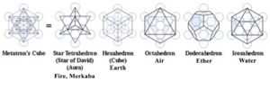 This sacred geometric symbol channels divine energy from Source through the Earth creating the Pillar of Light. It is the process of creation that began with a circle (torus), and expanded into two overlapping circles (vesica piscis – the union of God/Goddess producing a creation). Further expansion takes you to seven overlapping circles (Seed of Life – like an embryo), to 13 circles creating the “Fruit of Life”, the foundation of Metatron’s Cube. When straight lines are drawn to connect the centers of each circle, Metatron’s Cube is created. This sacred geometry contains all the platonic solids that are the foundation for all organic life and represent the five elements in nature: the star tetrahedron – a pyramid pointing up overlapping a pyramid pointing down (Fire and Merkaba), hexahedron (Earth), octahedron (Air), dodecahedron (Ether), icosahedron (Water). Other important sacred geometric forms are also found within – the Merkaba, and the Tree of Life.
